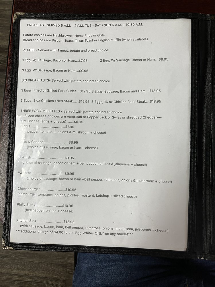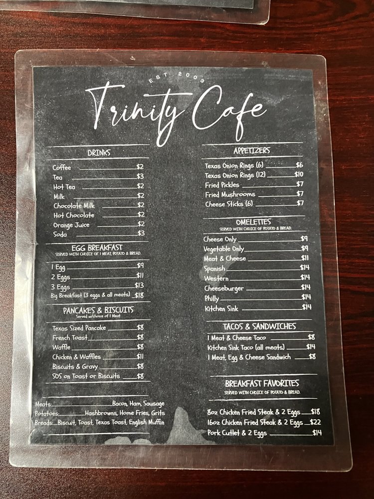 "Trinity Cafe" in Trinity, TX, offers a wide range of breakfast options, including three egg omelettes and classic egg plates. Customers rave about the quality of the food and the generous portions at affordable prices. The cafe boasts a welcoming atmosphere, perfect for families and casual dining. Visitors can enjoy traditional down-home cooking, like fried fish and chicken fried steak, as well as delightful sweet tea. The menu includes a variety of choices, from fish and burgers to the popular BLT with hand-cut fries. With friendly service, fresh coffee, and a clean environment, Trinity Cafe provides a taste of small-town charm and hospitality. If you're looking for a satisfying meal in a cozy setting, Trinity Cafe is a must-visit spot.